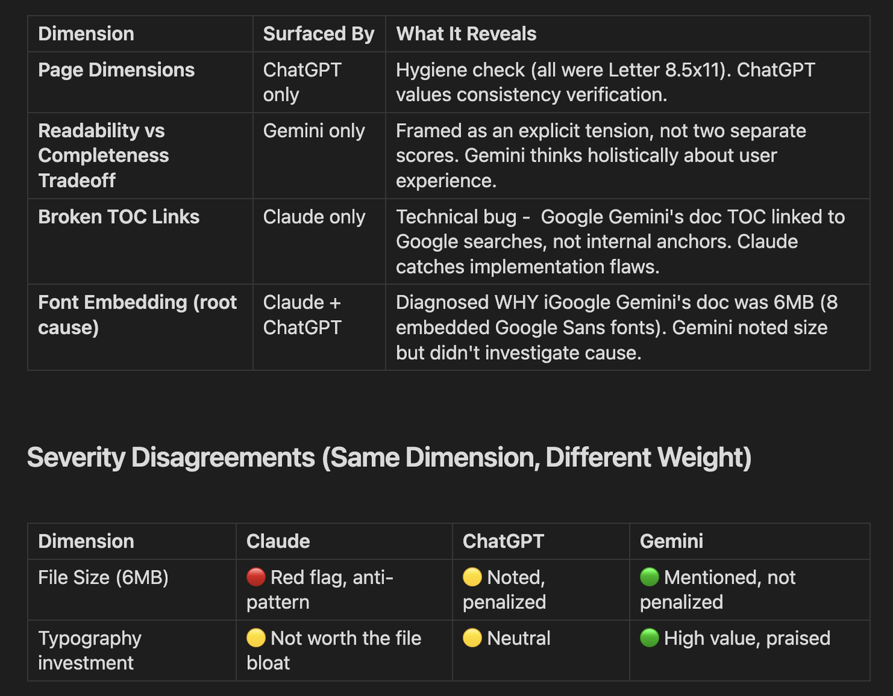 - Divergence: Where do evaluators disagree - on dimensions OR severity? This reveals what each model values.