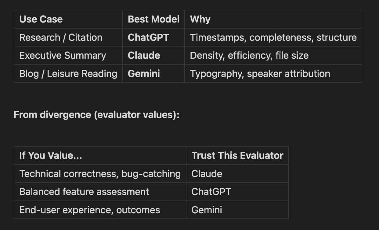 I listen to podcasts and convert transcripts (via Whisper) into formatted reference docs. I wanted to know which LLM produces the best output for this task.