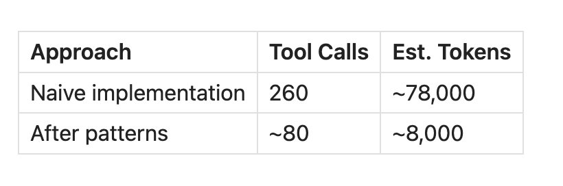 Both builds hit the same wall: token overhead. For the translation workflow with 65 paragraphs and four tool calls per step, that's 78,000 tokens before any actual work. The context window couldn't hold it, so the naive implementation simply failed.