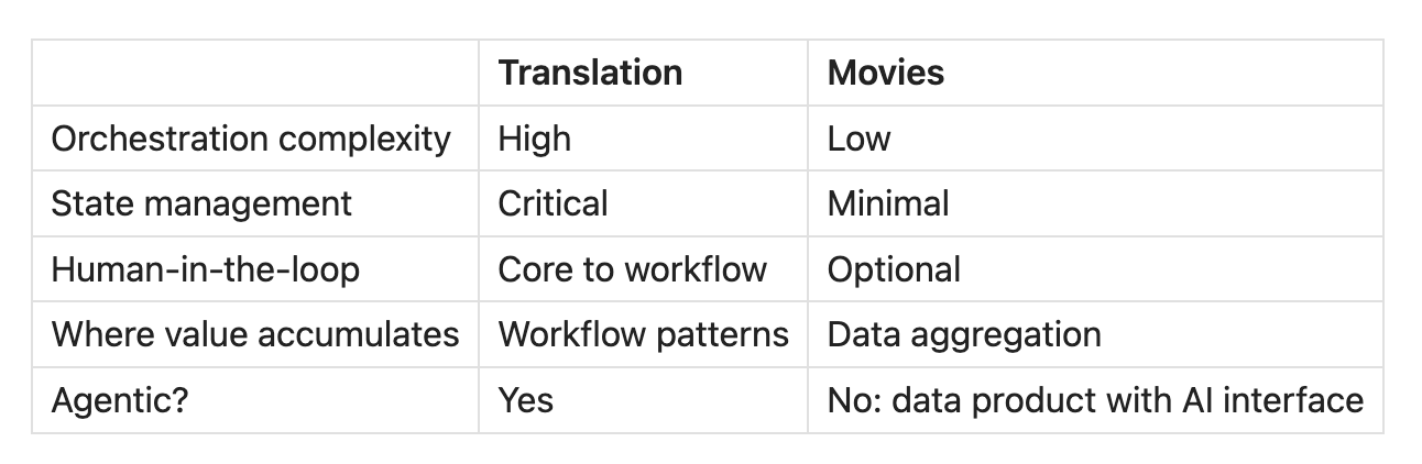 Compare to translation: 65 paragraphs, each requiring retrieval, translation, review, and approval, with state persisting across steps and human feedback shaping subsequent translations. The agent is the workflow.