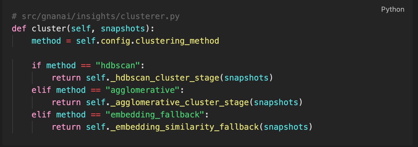 The Problem: Clustering 200 daily insights requires different algorithms depending on data quality—HDBSCAN for clean data, agglomerative clustering for salvage passes, metadata-based fallbacks when embeddings fail.