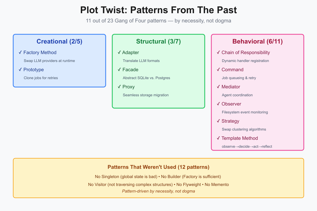 The result: 11 classical Gang of Four design patterns working in harmony beneath the LLM calls.