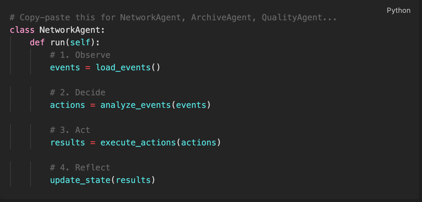 Impact: When I added the Network Watcher agent, it took 120 lines of domain logic. The observe → decide → act → reflect orchestration? Already done. Logging? Already done. Error handling? Already done.