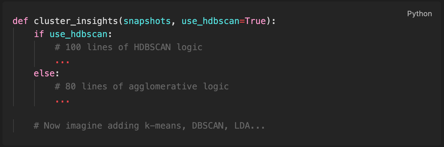 When I discovered cosine distance worked better than Euclidean for embeddings, I added it as a strategy. Old runs remained reproducible. New runs got better quality. Both strategies coexist for A/B testing.