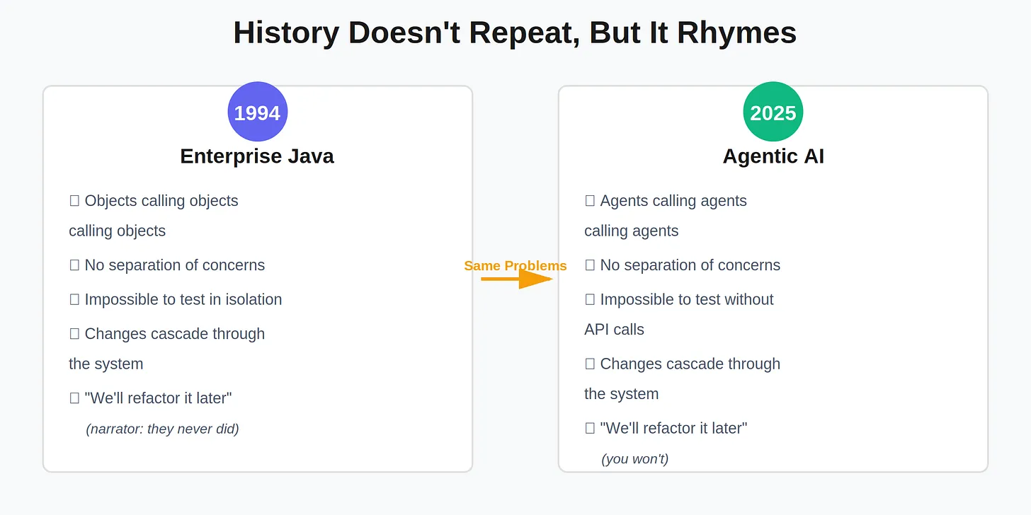 The exact same architectural problems that plagued enterprise Java in the 90s are plaguing Agentic AI in the 2020s. We just don’t recognize them because we’re distracted by the LLM calls.