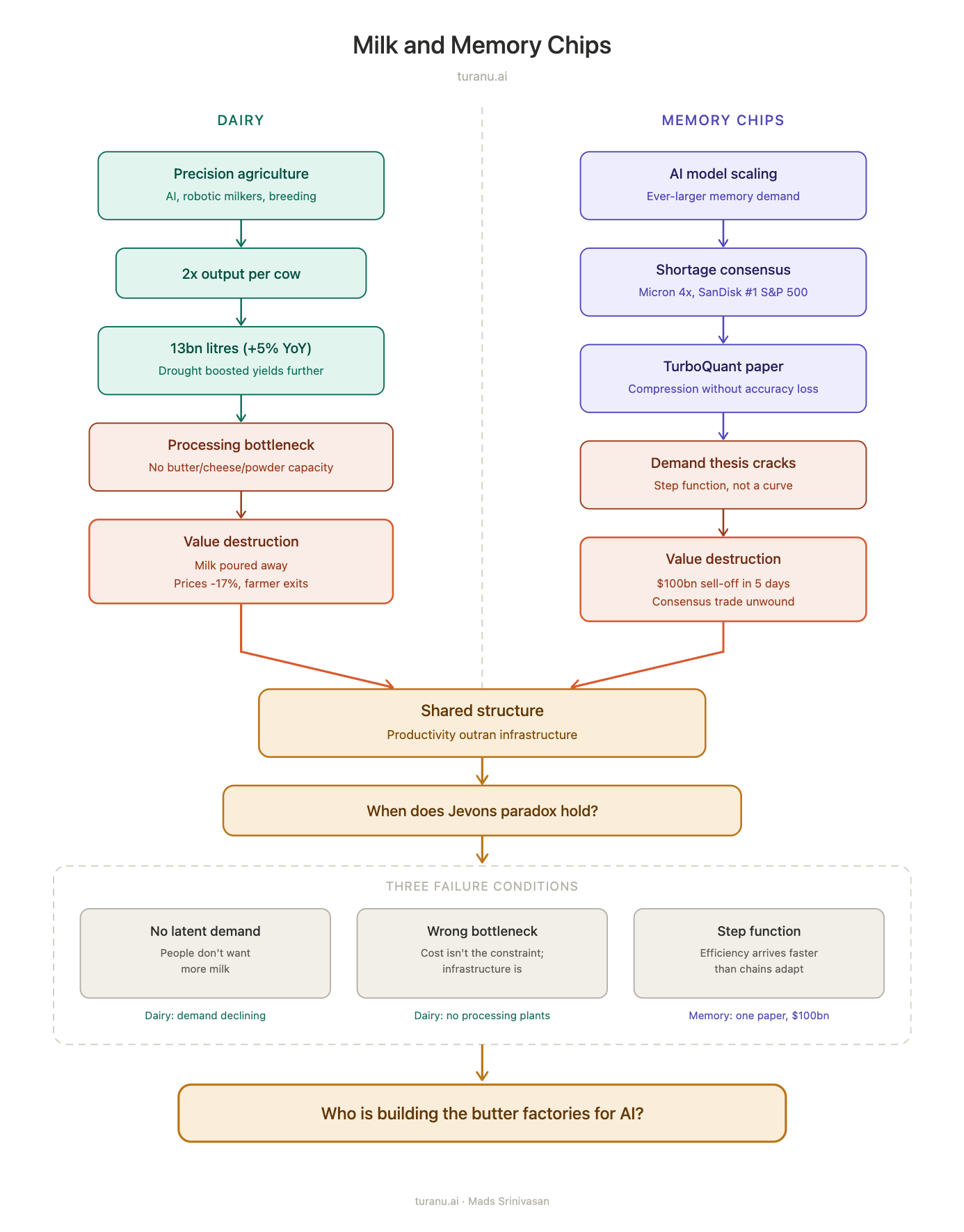 The pattern is the same in both cases: production capability advanced faster than the downstream system designed to capture its value. Britain built the world's most productive dairy herd and forgot to build the factories. The AI hardware trade priced in insatiable demand for memory and didn't price in that a single research paper could compress what the models actually need.